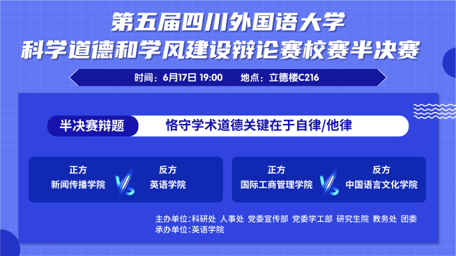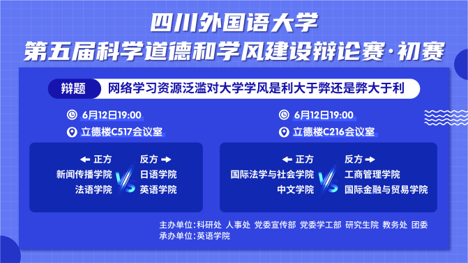 7月4日下午,四川外国语大学第五届科学道德和学风建设辩论赛在立德楼C216圆满落幕。全校8个学院队伍踊跃参与,我院辩论队凭借出色表现,历经初赛、半决赛层层角逐,最终夺得决赛冠军。
