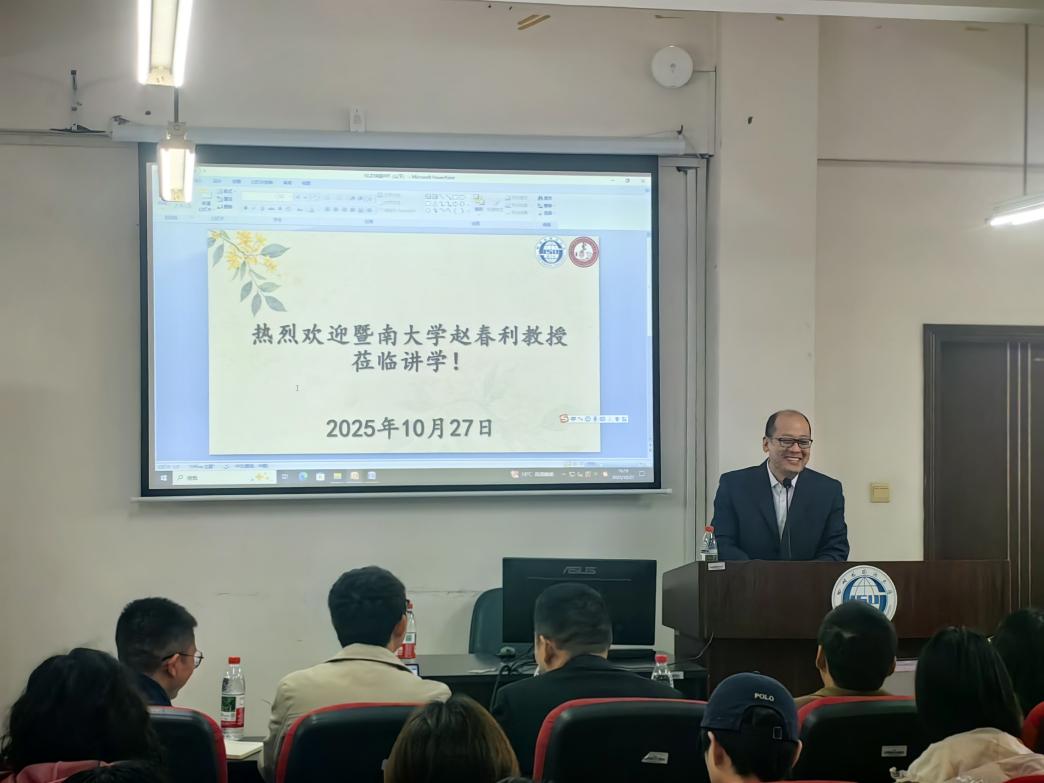 10月27日,暨南大学文学院赵春利教授应邀莅临我校,于博文楼6楼学术报告厅带来“悖理副词‘公然’的话语关联与二重情态”专题学术讲座。赵春利教授系博士生导师、博士后合作导师,广东省珠江学者特聘教授,同时担任广东省中国语言学会副会长、中国语言学会理事,学术造诣深厚。讲座由中国语言文化学院吴锋文教授主持,我院师生代表齐聚现场,座无虚席,学术交流氛围热烈浓厚。