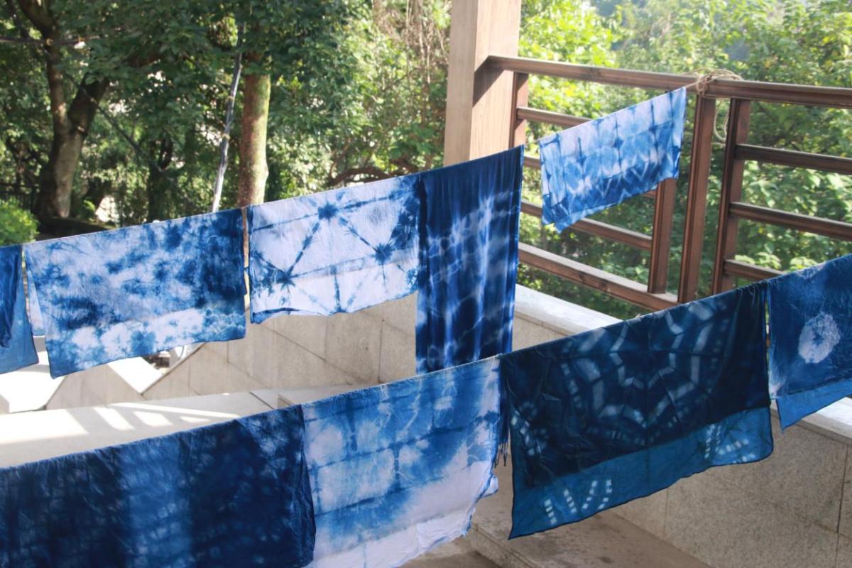 实操环节中,师生们尽情释放创意。小方桌前,大家手持白布,用棉线、皮筋肆意捆扎、折叠,将奇思妙想融入每一处褶皱。曹小琴老师现场展示“水波纹”“同心圆”的制作技巧,引发同学们踊跃提问,交流声与笑声交织,氛围温馨而热烈。染色环节,一个个捆扎好的“小粽子”浸入天然染料中,在时间的沉淀下吸饱蓝韵。待清洗晾干、拆开棉线的瞬间,惊喜接连上演:每一块布料都因捆扎力度、折叠方式的不同,呈现出独一无二的晕染效果,蓝白交织间,尽是自然随性的东方美学。