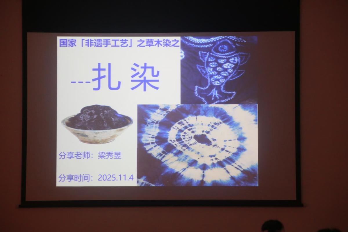 作为中国古代四大纺染技艺之一,扎染集文化底蕴、艺术美感与实用价值于一体。活动伊始,梁秀昱老师以一株蓝色草木的图片引发好奇:“这便是扎染的核心原料——板蓝根。”她介绍,除板蓝根外,马兰、蓼兰等草木皆可作为染料,尽显“万物皆可染”的自然智慧。随后,老师详细讲解染料制作工艺:将板蓝根的叶与根茎入水浸泡至腐熟,加入石灰水搅拌,打捞浮沫后静置沉淀,天然染料便应运而生。同时,她拆解了扎染的完整流程:从构思设计、扎结塑形,到染色固色,再到氧化、拆结、清洗防掉色,每一步都暗藏匠心。针对关键的扎结环节,老师重点演示了螺旋捆扎法、二次折叠法、一般捆扎法三种核心技法,为同学们的创作筑牢基础。
