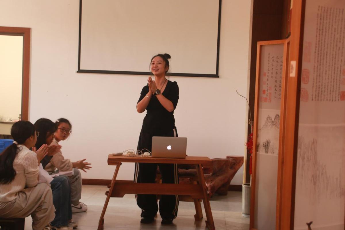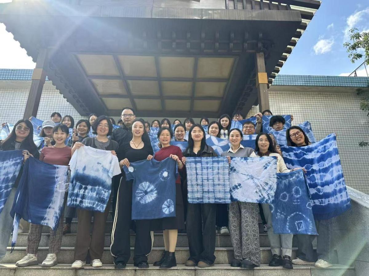 次日9时,中国传统文化研究与体验中心再迎热闹景象,80名师生怀揣对非遗文化的热忱,参与国家级非物质文化遗产——扎染实践活动。本次活动由汉语言文字学教研室主办,特邀非遗手工艺(古法蓝染、蜡染、扎染)传承人、重庆星斗源文化传播有限公司总经理梁秀昱女士,携手助教曹小琴老师,带来一场沉浸式的扎染探索之旅。