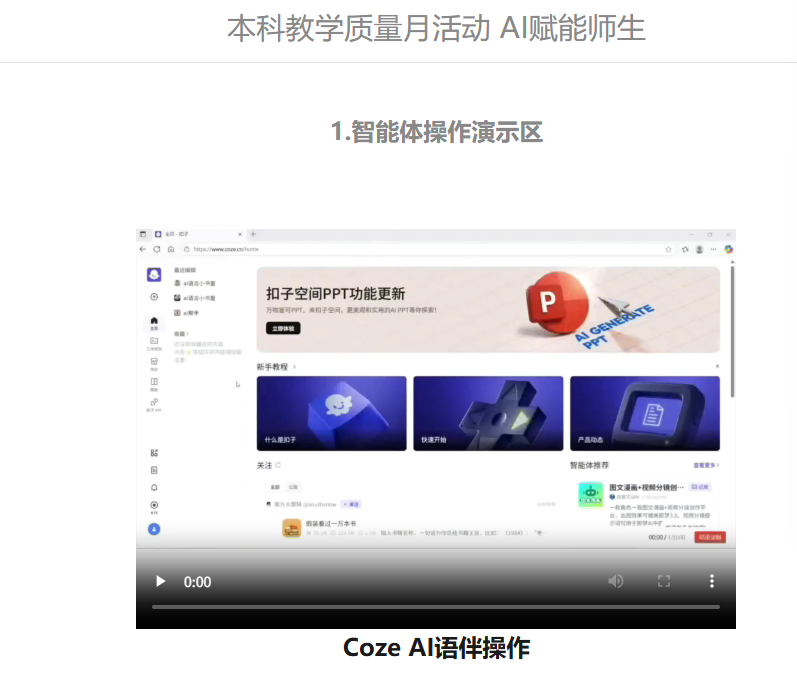 学院官网专门建设了“智能体操作演示区”和教学资源下载专区,集中展示Coze AI语伴、秘塔AI、数字人微课等前沿教育技术应用案例,为师生提供了丰富的AI教学工具包和实践指南。