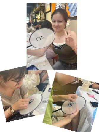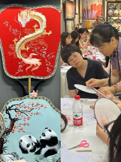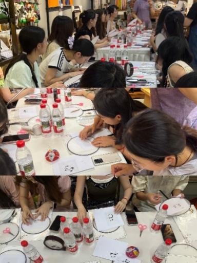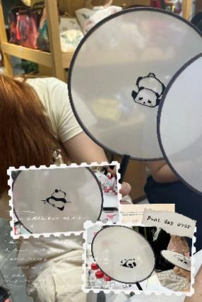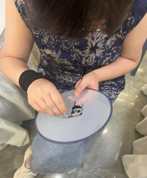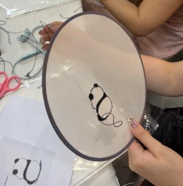 尽管屋外骄阳似火,屋内却意趣盎然。熊猫作为巴渝文化的经典标签,成为本次传统文化体验活动的重要元素。同学们接受的挑战是:如何零基础快速上手,在团扇扇面上绣出精美的熊猫图案。