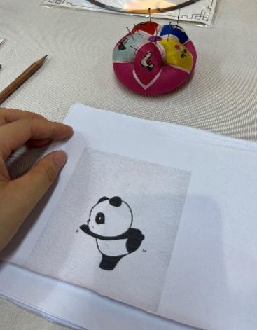 随着开头的顺利完成,闫老师又传授了滚针和齐针两种技法,同学们先用滚针勾勒出熊猫灵动的身体轮廓,再用齐针填充好它憨态可掬的四肢。大家手中的第一根丝线即将用完时,则需要用到收针法——来回上下穿插数针,将线尾收束。接下来的时间,师生们在藏针、滚针、齐针和收针四种基础针法间不断转换与重复,耐心完成手上的刺绣作品。