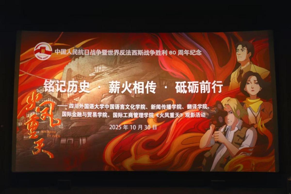 为传承红色基因,弘扬反法西斯战争中的英烈精神与国际主义情怀,四川外国语大学中国语言文化学院、新闻传播学院、翻译学院、国际工商管理学院、国际金融与贸易学院于2025年10月30日下午联合举办《火凤重天》红色观影暨主创交流活动。五大学院师生代表齐聚一堂,在光影浸润与深度对话中回望峥嵘岁月,汲取奋进力量。