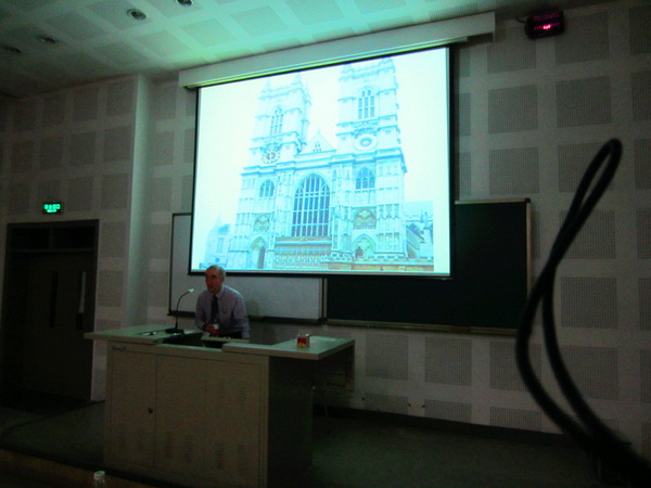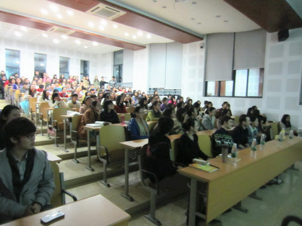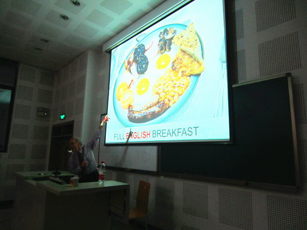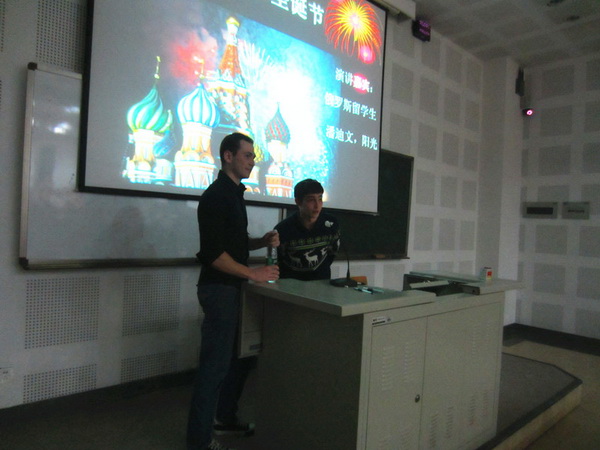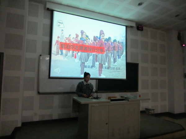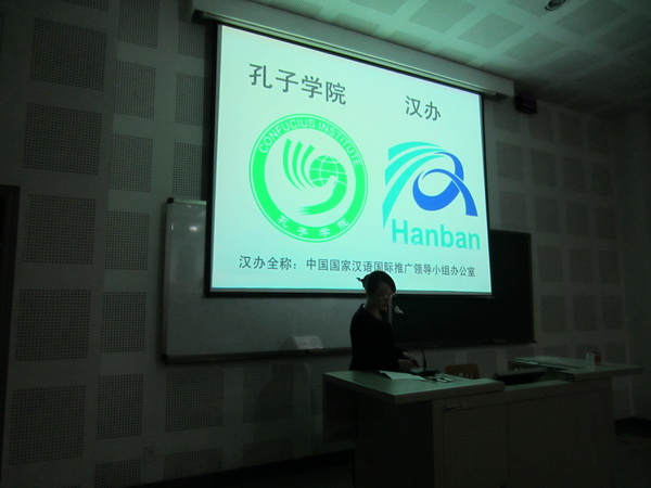 外教John Condon首先上台幽默地用英文向我们介绍了英国的文化。他举例说明了英国人与中国人的区别之处和共同点。同时,提到了高税收以及健全的社会保障等社会情况。他澄清了伦敦是雾都的传言,据John说伦敦的天很蓝。第二个上台演说的是韩国留学生李珠熙。她用流利的中文从大学生活、军训、军队、传统节日、饮食文化几个方面进行了分享。随后由中文流利的潘迪文、阳光向我们展现了俄国传统节日:新年和圣诞节。紧随其后的是黎楠老师,她向我们展示了她在东非教中文时期的照片,同时为我们提供了有关汉办的孔子学院多方面的信息。她提示我们:“参加志愿者选拔,需要普通话二级证书、公共六级425分以上、中国传统才艺等。”最后12级同学温影向我们讲诉了在尼泊尔担任志愿者的经历。通过色彩鲜明、宗教文化浓烈的照片,她跟我们分享了在尼泊尔“快乐、贫穷、感动、分享”的故事。
