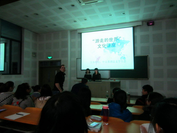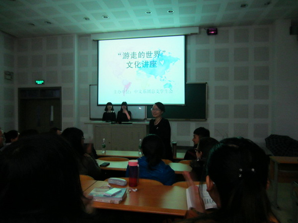 3月20日晚7点,我系在b2-2举行"游走的世界"主题讲座。到场嘉宾有:英国外教John Condon,韩国留学生李珠熙,俄国留学生潘迪文、阳光,中文系教师黎楠,中文系12级学生温影。主持人成良君、孙梦媛采用双语主持方式开启此次主题讲座:“古老的文化,不同的风景,串联起游走的世界”。