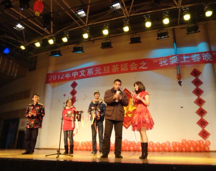 2011年12月25日晚7点,西区锦绣楼活动中心热闹非凡,洋溢着喜庆欢乐的气氛,中文系2012年元旦茶话会之“我要上春晚”在此举办。中文系主任谭代龙老师、中文系党总支书记卢玫老师和中文系的老师们出席了此次茶话会,与同学们一同欢庆佳节。