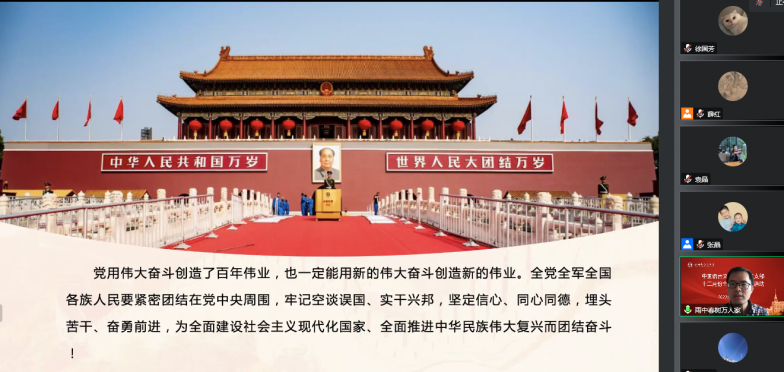 为深入学习贯彻党的二十大精神,感悟思想伟力,汲取奋进力量。2022年12月9日下午,中国语言文化学院教职工党支部开展“凝心聚力新时代,新征程上再出发”主题党日活动,本次活动由教工党支部书记耿战超同志主持,学院全体教职工党员通过腾讯会议参加了本次活动。