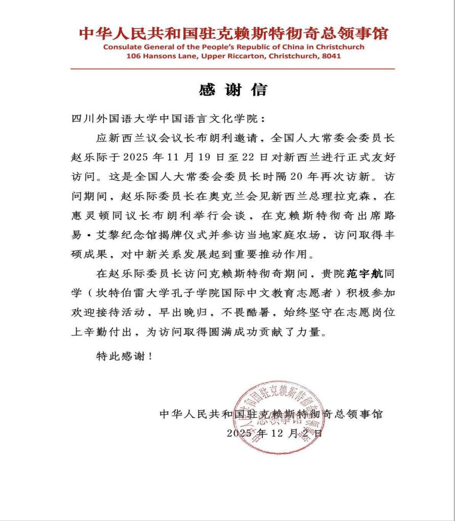 近日,我校中文学院收到中华人民共和国驻克赖斯特彻奇总领事馆发来的感谢信。信中对学院派驻新西兰坎特伯雷大学孔子学院的范宇航同学予以高度表扬。