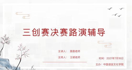 2021年7月18日晚,中国语言文化学院举办了“三创赛决赛路演辅导”讲座,此次活动通过线上会议举行。