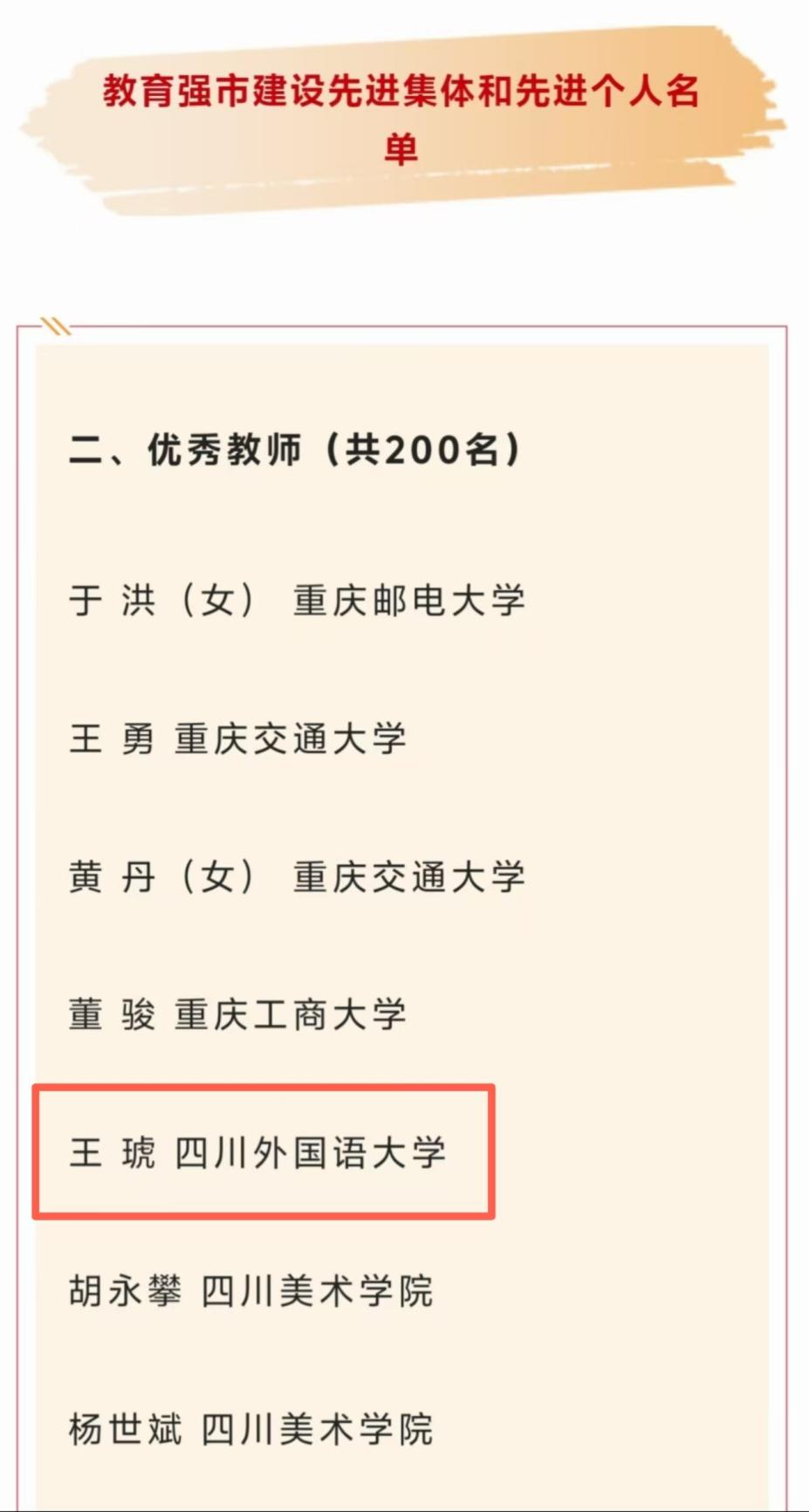 9月22日,重庆市人力资源和社会保障局、重庆市教育委员会联合发布《关于表彰教育强市建设先进集体和先进个人的决定》,100个单位和300名个人受到表彰。我院王琥老师被表彰为优秀教师。恭喜王琥老师!