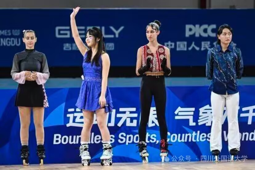 8月17日上午,在成都轮滑运动中心举行的成都世运会自由式轮滑女子花式绕桩决赛中,代表中国队出战的四川外国语大学中国语言文化学院2022级学生刘佳欣获得银牌,另一名中国选手朱思怡获得金牌。