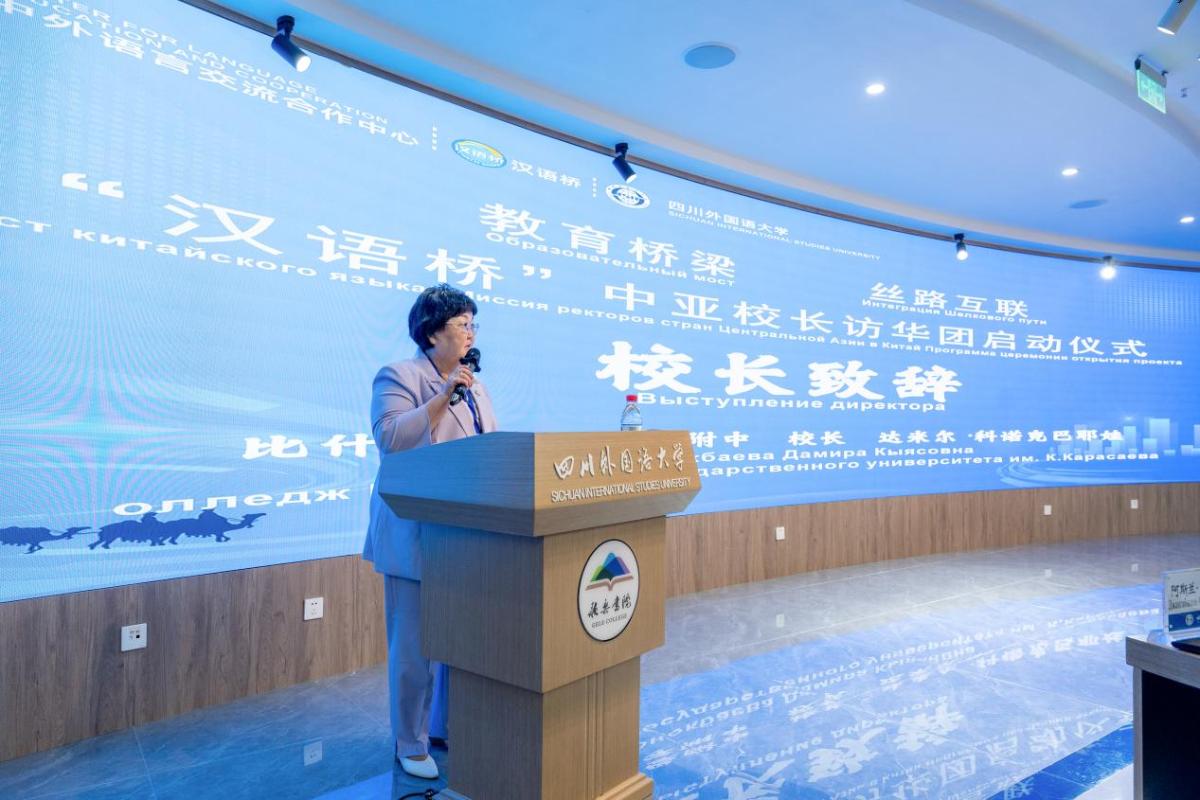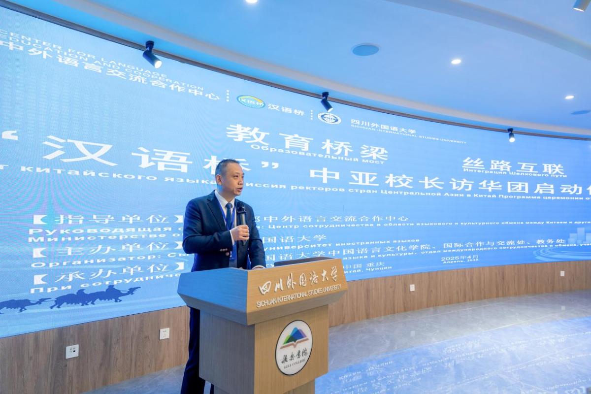 董洪川校长出席启动仪式并致辞。董校长介绍了川外历史、学科特色及国际化办学成果。他强调,中亚校长访华团以“教育桥梁 丝路互联”为核心理念,通过文化考察、学术论坛、院校交流等形式,促进双方教育理念互鉴、人才共育,探索“人工智能+国际中文教育”等前沿领域合作。董校长冀望双方以学术对话探索技术赋能路径,以院校联动共谋合作机制,携手书写“各美其美,美美与共”的教育新篇章。