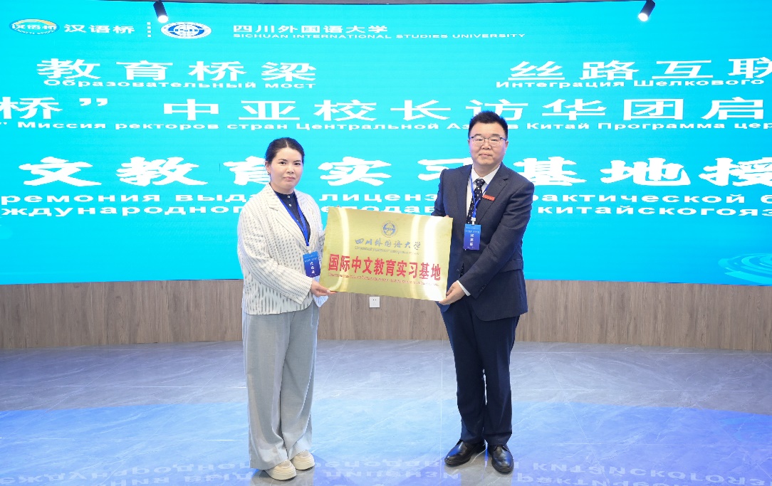 项目启动仪式上,我校与比什凯克国立大学达成共建国际中文教育实习基地合作共识。董洪川校长代表学校向比什凯克大学授予了“四川外国语大学国际中文教育实习基地”牌匾。