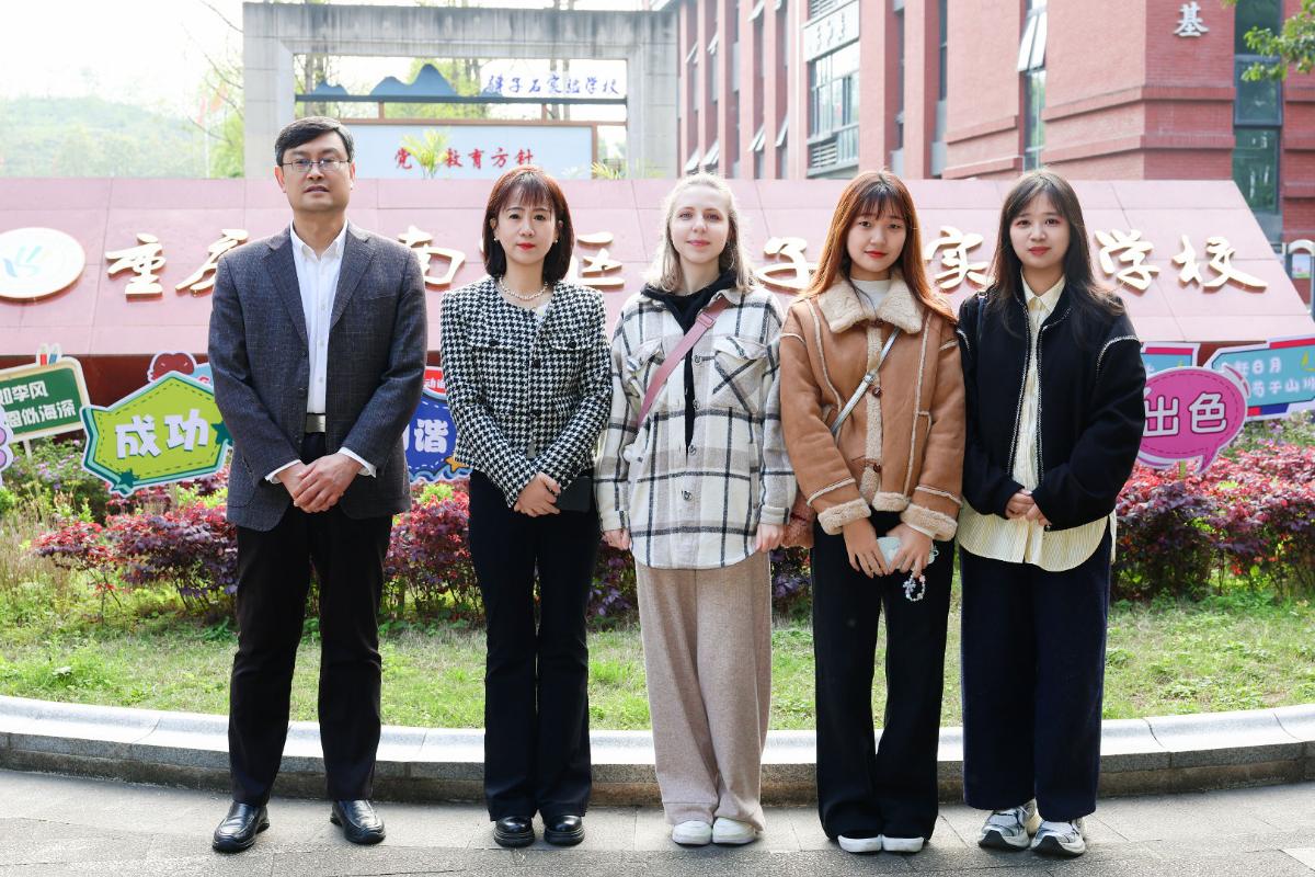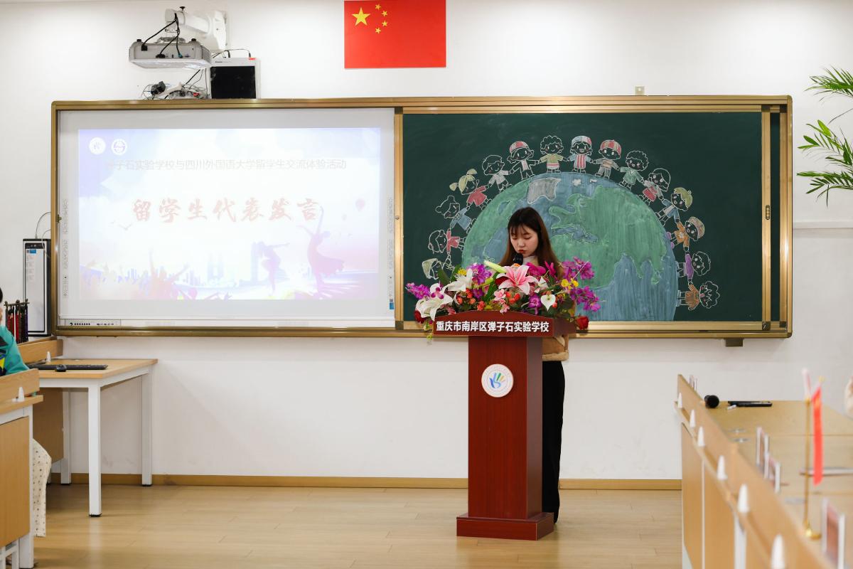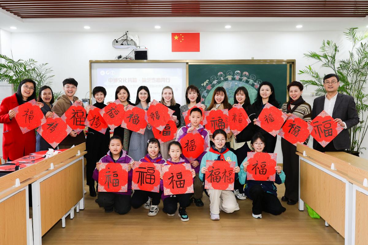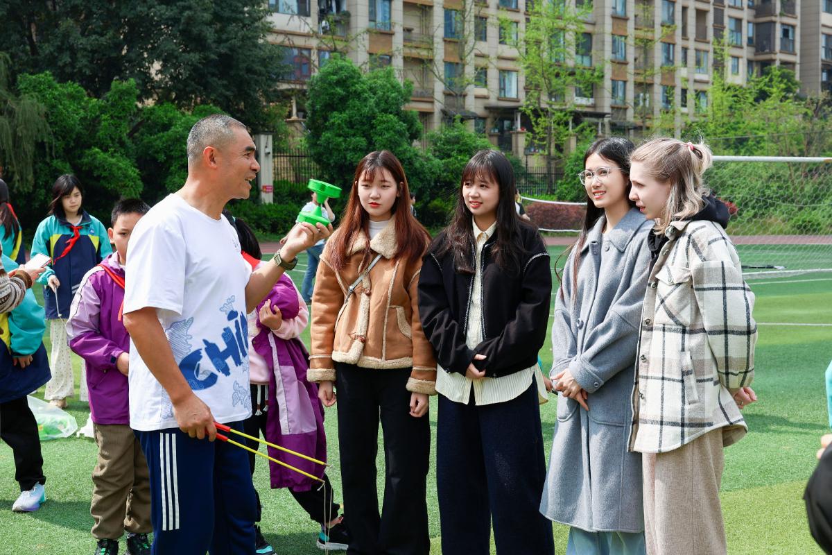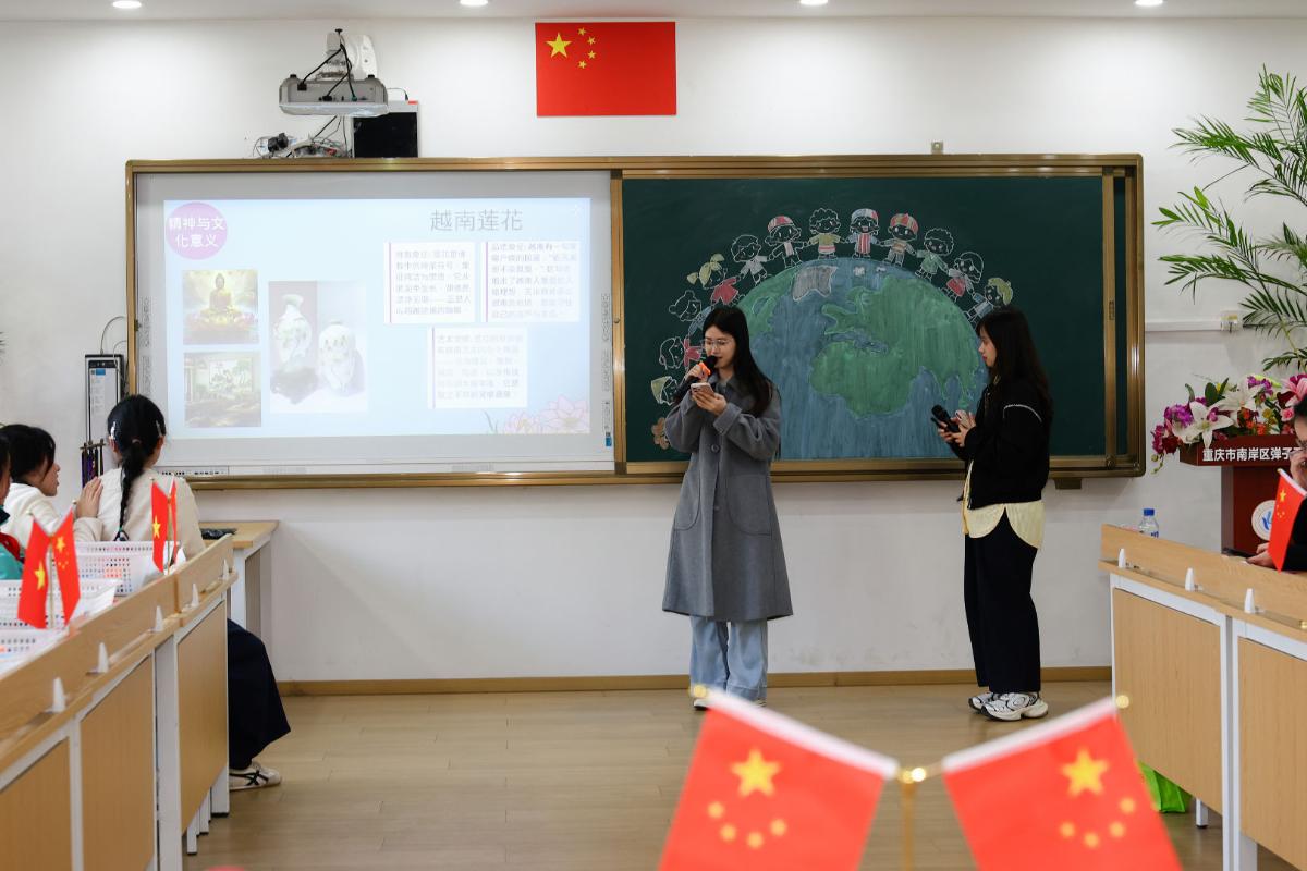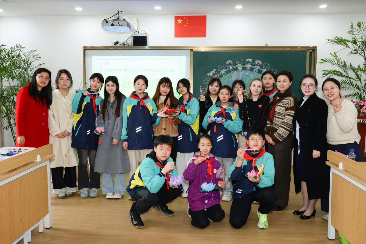 为深化国际理解教育实践,搭建中外青少年跨文化交流的坚实桥梁。近日,四川外国语大学中国语言文化学院留学生阮氏翠贤(越南)、吴秋妆(越南)、阮梅英(越南)和沈彦雯(俄罗斯)在余晶晶的带领下,于重庆市南岸区弹子石实验学校参加了一场以“中外文化共融·体艺连心同行”为主题的国际交流体验活动。我院以文化为纽带、以体艺为桥梁,在双向互动中浸润多元文化底蕴,在心灵共鸣中缔结跨国友谊。