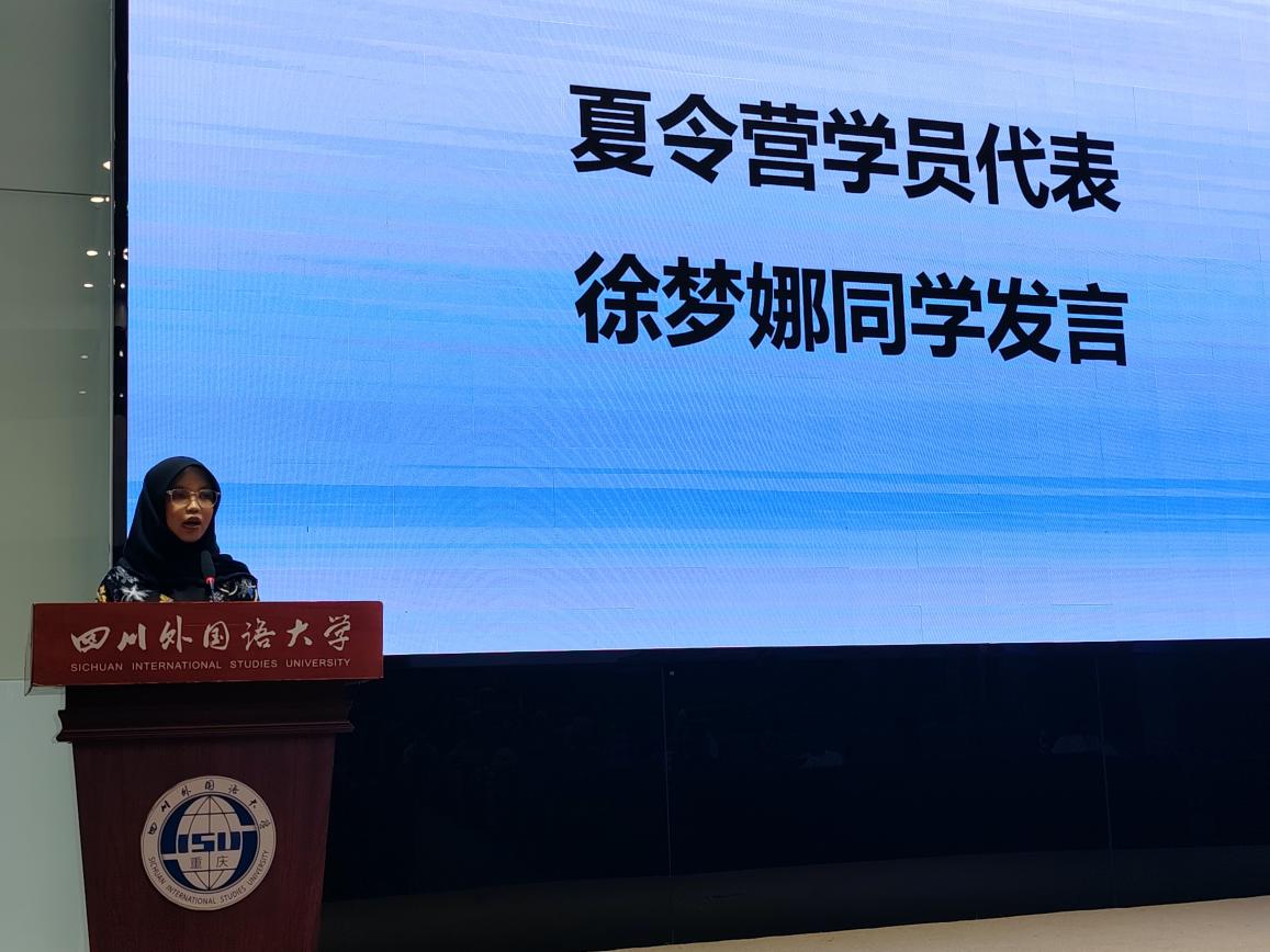 印尼布拉维加亚大学学生徐梦娜代表全体营员感谢中国国家留学基金委和四川外国语大学为中印尼青年搭建的“语言+技能+文化”三位一体的学习平台。她指出,随着抖音、阿里巴巴国际站等电商平台在印尼的不断开拓,两国商家对“中文+跨境电子商务”复合型人才的需求日益迫切,而此次夏令营的举办正是破解人才供不应求难点的一把钥匙。徐梦娜表示,营员们对中国语言文化以及直播模式、供应链管理经验等充满好奇,相信大家不会辜负学校与老师们的殷切期望,定能成为“中国电商模式”的本土化传播者,助力书写中国和印尼跨境电商合作的新篇章。