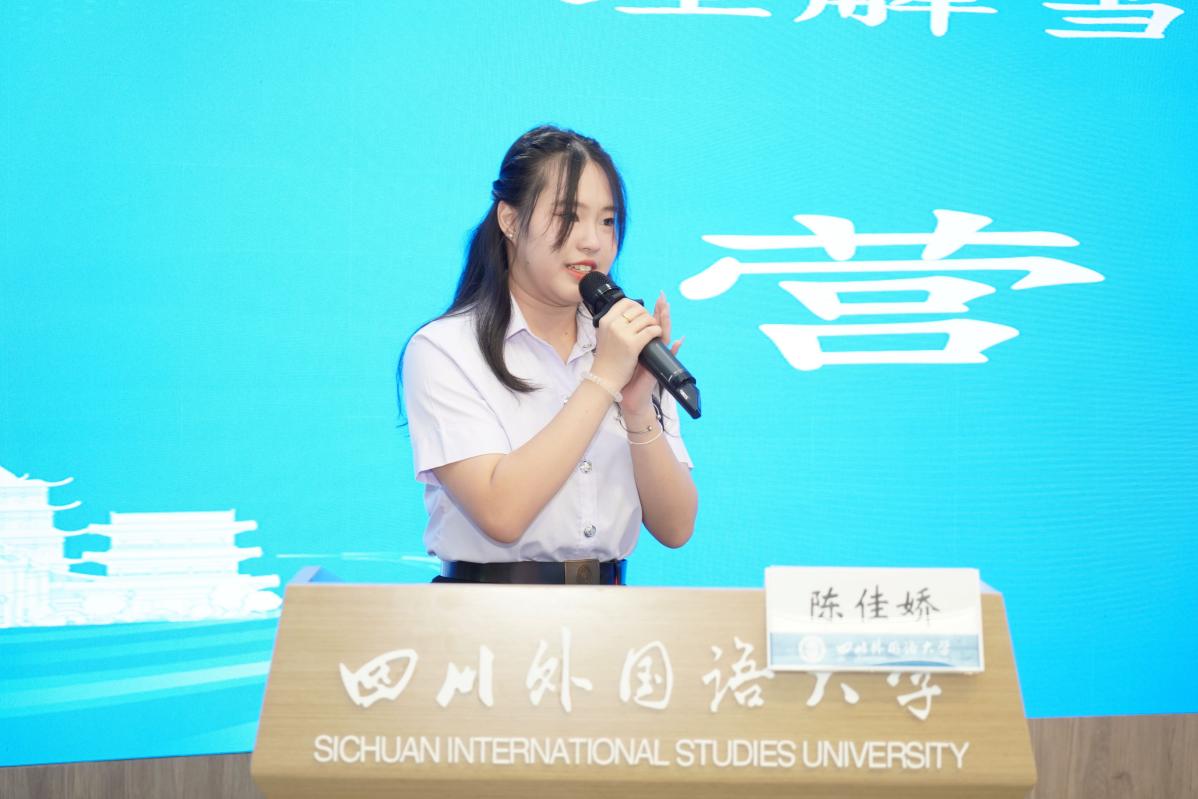 泰国清迈皇家大学学生陈佳娇代表所有学员向中国政府提供的宝贵奖学金机会、川外的精心安排以及老师们的辛勤付出表示诚挚感谢。她表示,夏令营让泰国大学生看到了一个更为鲜活的当代中国。中国不再是遥远的符号,而是火锅里翻滚的红油、舞台上神秘的变脸、天空中绚丽的无人机秀、大街小巷中国人的热情。陈佳娇承诺一定会做中泰友好交流的使者,把在中国的所见所闻带回泰国,用他们的故事搭建起中泰青年理解的桥梁。