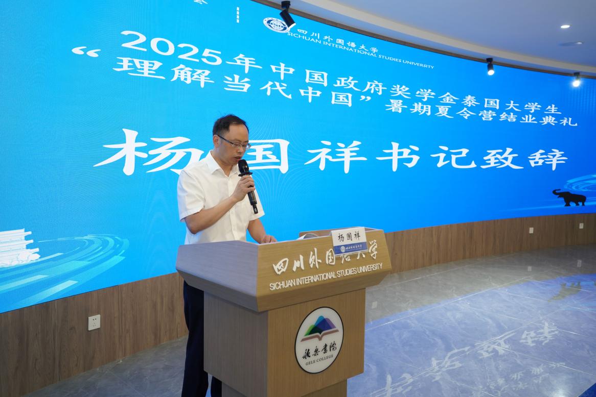 杨国祥书记首先代表学校向所有营员顺利完成学业表示热烈祝贺,对参与和支持春令营工作的老师和志愿者表示感谢。他在致辞中指出,营员们在课堂中聆听中国当代发展的故事,在文化体验中触摸中华文明的脉络,在实地考察中感受中国社会的活力。这些经历,推动了学员深入走进中国、读懂中国、理解中国,促进了对当代中国的认知、认同和热爱。杨书记长寄语营员们未来成为中国故事的讲述者、中泰对话的践行者,用客观的讲述打破偏见,用真诚的交流消弭隔阂,让更多泰国民众听见理性而温暖的中国故事和中国声音。