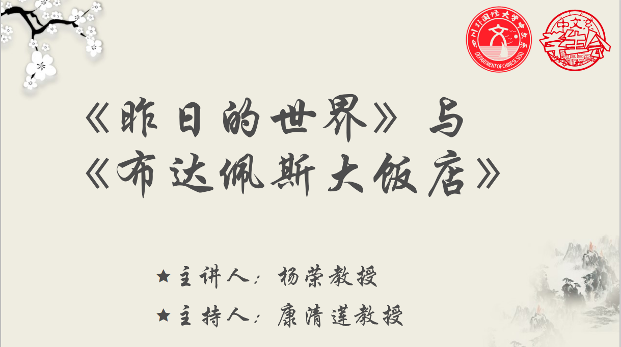 2020年10月22日14:30,中文系有幸邀请到西南民族大学杨荣教授为我校学子做了题为“《昨日的世界》与《布达佩斯大饭店》”的讲座。此次讲座于西区教学楼B1-2成功举办,并由我系康清莲教授担任主持人。